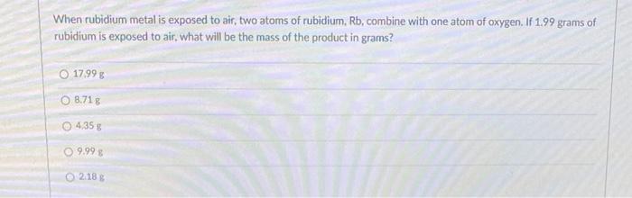 Rubidium has also been reported to ignite spontaneously in air. When rubidium metal is exposed to air two atoms of rubidium Rb combine with one atom of oxygen. If 175 grams of rubidium is exposed to air what.